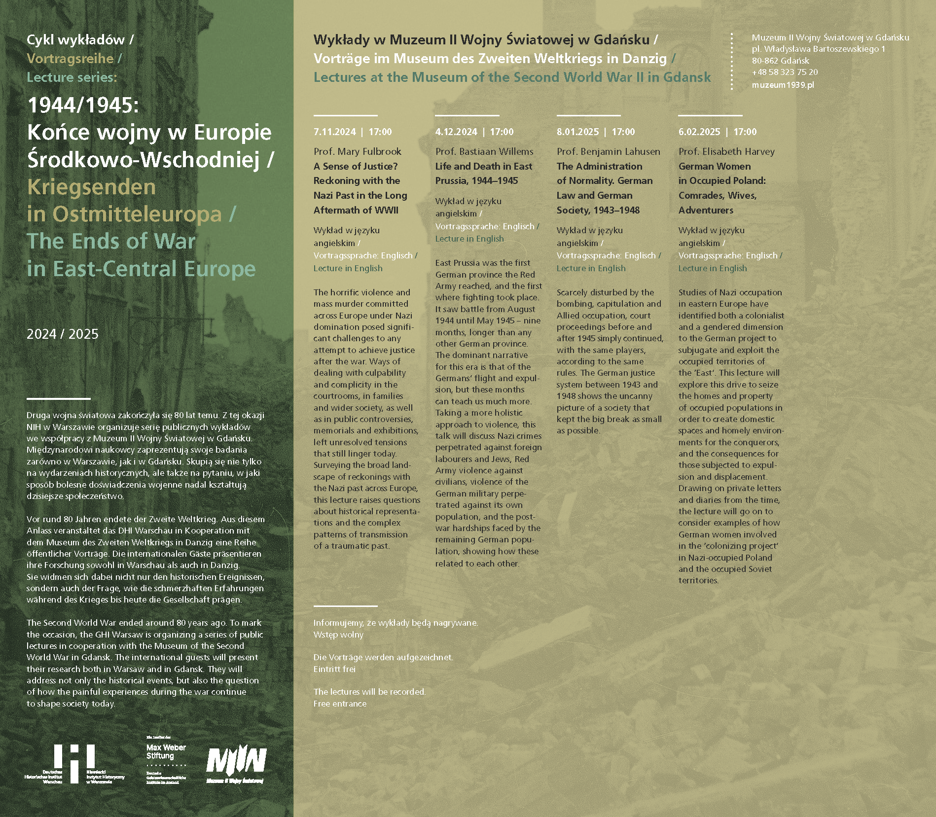 Druga wojna światowa zakończyła się 80 lat temu. Z tej okazji Niemiecki Instytut Historyczny w Warszawie organizuje serię publicznych wykładów we współpracy z Muzeum II Wojny Światowej w Gdańsku. Międzynarodowi naukowcy zaprezentują swoje badania zarówno w Warszawie, jak i w Gdańsku. Skupią się nie tylko na wydarzeniach historycznych, ale także na pytaniu, w jaki sposób bolesne doświadczenia wojenne nadal kształtują dzisiejsze społeczeństwo.