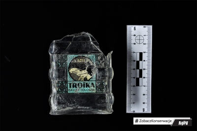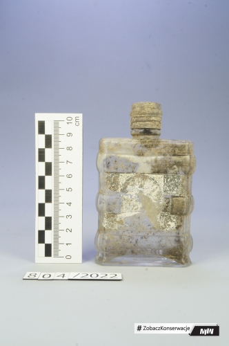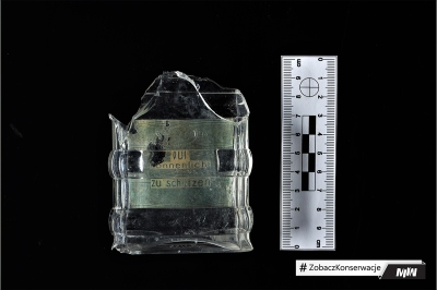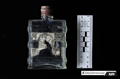 Sporym wyzwaniem (w przypadku butelki zachowanej w całości), było odseparowanie metalowej nakrętki i oczyszczenie butelki od środka. Nie było to zadanie łatwe, ponieważ nakrętka wykonana z cienkiej metalowej blaszki, w wyniku długoletniego zalegania w ziemi, była skorodowana i krucha. Podczas konserwacji nakrętkę delikatnie oczyszczono z produktów korozji, a następnie zabezpieczono odpowiednimi powłokami antykorozyjnymi.