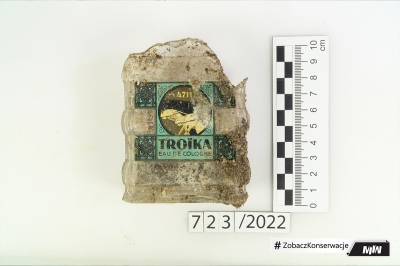 W pierwszej kolejności przystąpiono do konserwacji resztek papierowych etykiet. W momencie przekazania do konserwacji były one mocno zawilgocone. Należało przeprowadzić prace w taki sposób, by nie narazić ich na zbyt gwałtowne wyschnięcie. Najpierw wykonano dezynfekcję, następnie resztki papierowych naklejek oczyszczono z luźnych zabrudzeń ziemistych, odkwaszono i wzmocniono bibułą japońską.