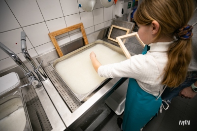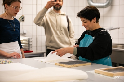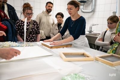 W pracowni konserwacji zabytków uczestnicy ENM mogli wziąć udział w pokazie czerpania papieru metodami tradycyjnymi oraz oczyszczania powierzchni przedmiotów metalowych przy użyciu mikropiaskarki.