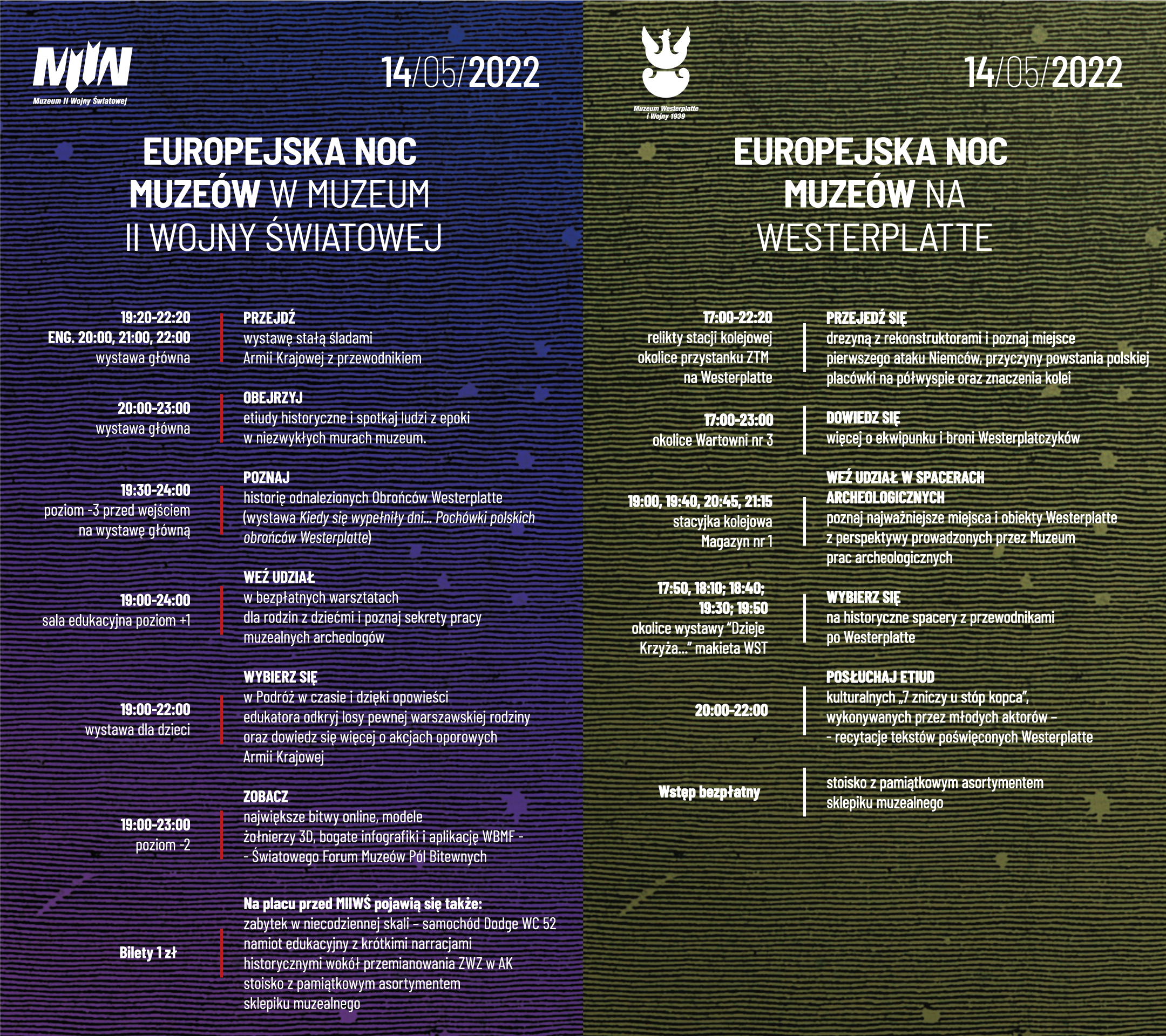 W ramach ENM nasi goście w Muzeum mieli okazję wybrać się na spacer "Śladami Armii Krajowej" po wystawie stałej (z przewodnikiem), a także posłuchać edukacyjnej opowieści o pewnej warszawskiej rodzinie i przeżyć "Podróż w czasie" na wystawie dla dzieci. Na warsztatach edukacyjnych można było dowiedzieć się więcej o niezwykle ważnej pracy muzealnych archeologów, a także poznać lepiej historię odnalezionych obrońców Westerplatte, oglądając wystawę "Kiedy się wypełniły dni...", przygotowaną przez ich zespół. Na specjalnie przygotowanym stanowisku zaprezentowano również najnowszą aplikację WBMF (Światowego Forum Pól Bitewnych), która pozwala poznać wielkie bitwy w przestrzeni online oraz obejrzeć wyjątkowe infografiki i nowoczesne modele 3D.
