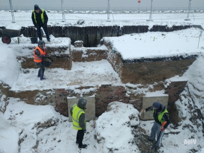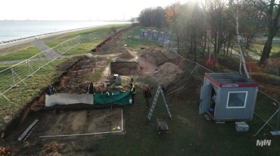 W trakcie tego etapu badań rozpoczęto również poszukiwania szczątków legionisty Mieczysława Krzaka. Był on członkiem załogi WST, gdy wybuchła II wojna światowa. Obsługiwał moździerze, a po ich zniszczeniu walczył w rejonie placówki „Fort”. Zginął 2 września lub niedługo później. Jego zwłoki polscy żołnierze zasypali w miejscu, w którym poległ – na stanowisku obserwacyjnym znajdującym się prawdopodobnie przy blaszanym falochronie na przedpolu placówki. W styczniu 1940 r. polscy więźniowie niemieckiego obozu Stutthof przymusowo sprzątający obszar WST znaleźli zamarznięte, częściowo rozłożone ciało polskiego żołnierza, które Niemcy nakazali im spalić. Zbieżność zauważonych przez jednego z więźniów obrażeń głowy, widocznych na rozkładających się zwłokach, z ranami odniesionymi przez leg. Mieczysława Krzaka, opisanymi przez jego towarzyszy broni, może świadczyć, że może to być ten sam mężczyzna. Lokalizacje obszaru objętego badaniami wytypowano na podstawie kwerendy połączonej z analizą archiwalnych zdjęć. Wzdłuż falochronu w rejonie placówki „Fort” wyznaczono sondaże o łącznej powierzchni 122 m². Niestety w żadnym z nich nie odnaleziono ani szczątków ludzkich, ani warstwy mogącej być śladem po ich spaleniu. W wyniku badań odkryto murowane relikty pruskiej baterii plażowej, umocnienia ziemne, rozpoznano konstrukcję falochronu z blachy falistej, zarejestrowano przebiegu niemieckiego okopu z 1945 r. oraz ślady prac ziemnych prowadzonych przy falochronie od drugiej połowy XX do początków XXI w. Murowane relikty są częścią wzniesionego w latach sześćdziesiątych XIX w. i rozbudowanego w połowie lat siedemdziesiątych budynku laboratorium prochowego będącego elementem pruskiej baterii plażowej. Odsłonięto fragment zewnętrznego, południowego muru wraz z reliktami ścian wewnętrznych. Mury wzniesiono z cegieł maszynowych wykonanych w cegielni w Kolibkach. Na zewnątrz budynku odsłonięto bruk z polnych kamieni. Warstwa ta znajdowała się około 2,5 m poniżej dzisiejszego poziomu terenu. Baterię plażową zaczęto rozbierać w 1881 r. – ślady tej działalności, w postaci warstwy gruzu, również zarejestrowano w trakcie badań. Na początku XX w., gdy rozpoczęto budowę nowego systemu obronnego, gruz wraz z pozostałościami budynku zasypano piaskiem, żwirem i gliną, tworząc wał pełniący funkcję ziemnego falochronu dla betonowego stanowiska dowodzenia artylerią nabrzeżną wybudowanego w 1911 r. (późniejsza placówka „Fort”). W sondażach uchwycono południowy stok wału – stok północny został zniszczony podczas budowy nowych umocnień brzegowych, chroniących obszar półwyspu na prawie całej długości. Do ich budowy wykorzystano panele stalowej ocynkowanej blachy falistej o szerokości około 0,5 m, które zachodziły na siebie i były połączone nitami. Konstrukcję od południa stabilizowały metalowe odciągi umocowane w pionowo ustawionych betonowych płytach, do których zaparcia miejscami wykorzystano ceglane relikty baterii. Analiza stratygrafii przebadanych obiektów wskazuje, że falochron z blachy falistej wykonano najprawdopodobniej w drugiej dekadzie XX w. Podczas badań udokumentowano również niemiecki okop z okresu końca wojny usytuowany w odległości 4–8 m na południe od falochronu. Biegnący zakosami rów w górnej partii miał szerokość dochodzącą do 1,5 m i zwężał się schodkowo ku dnu do szerokości 40–80 cm; jego głębokość sięgała 80–100 cm. W sondażach przylegających do falochronu nie zarejestrowano żadnych nawarstwień związanych z okresem funkcjonowania WST. Niestety zostały one zniszczone przez prace ziemne prowadzone pod koniec XX wieku i na początku XXI w., których ślady w postaci podłużnych, głębokich wkopów również zarejestrowano podczas badań. Jedyne pozostałości związane ze składnicą odsłonięto w sondażu odsuniętym od falochronu i znajdującym się na północny-wschód od placówki „Fort”. Był to fragment muru z cegły maszynowej stanowiący pozostałość niewielkiego budynku o lekkiej konstrukcji, być może pełniącego funkcję stróżówki. Obiekt został rozebrany prawdopodobnie podczas przygotowywania WST do obrony.